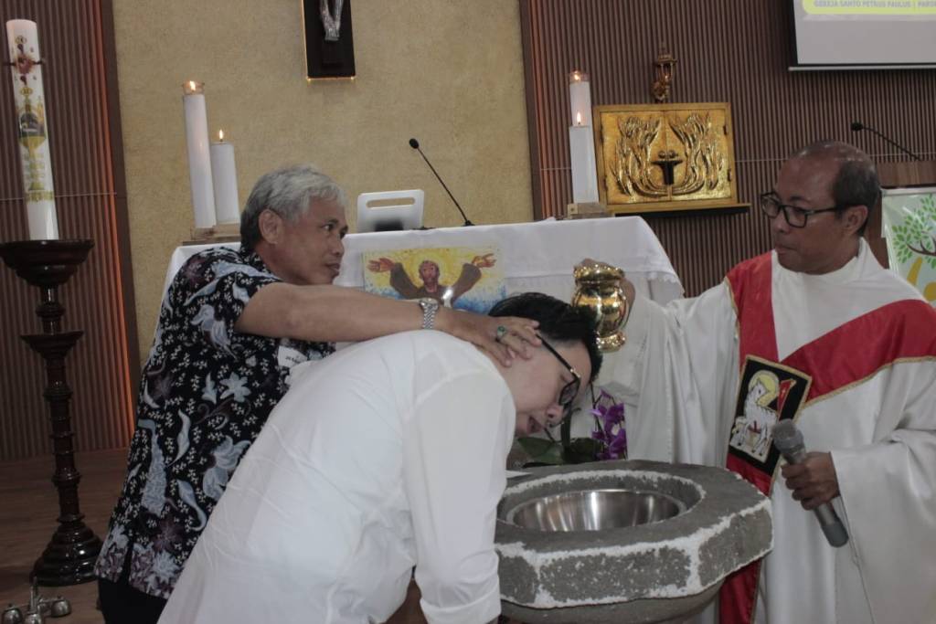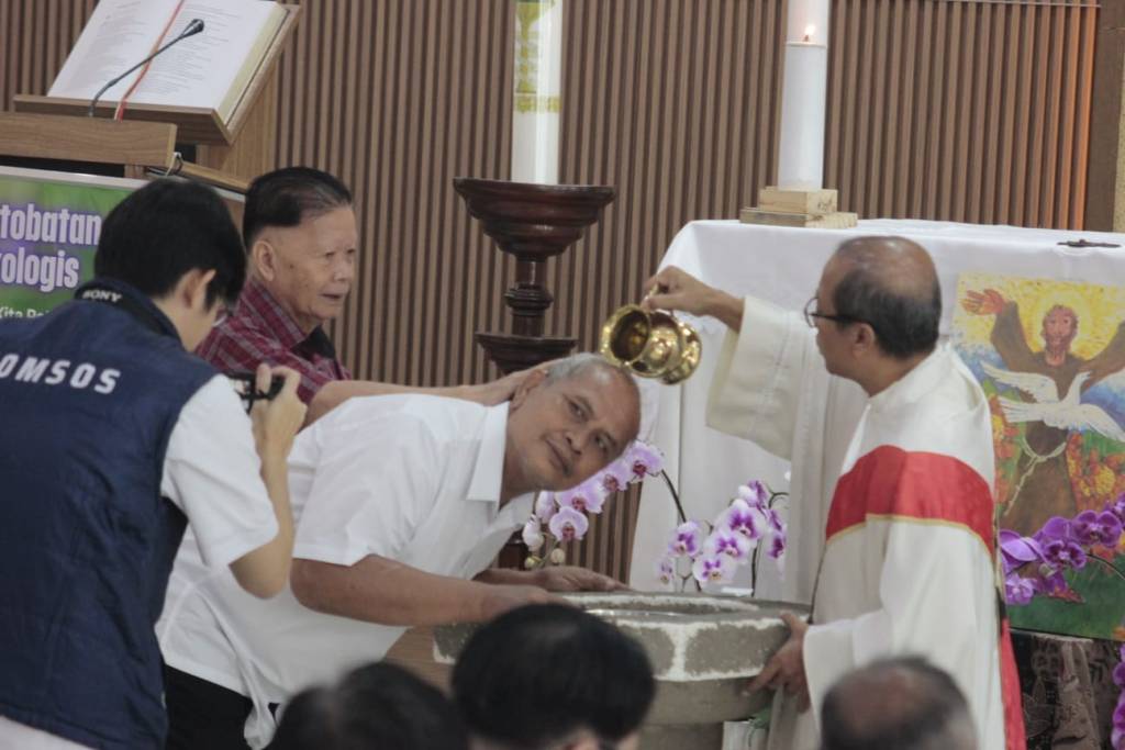 Upacara pembabtisan dalam Misa Penerimaan Sakramen Inisiasi di Gereja St Petrus dan Paulus Mangga Besar, Minggu (19/4/2026). Foto: Jaka